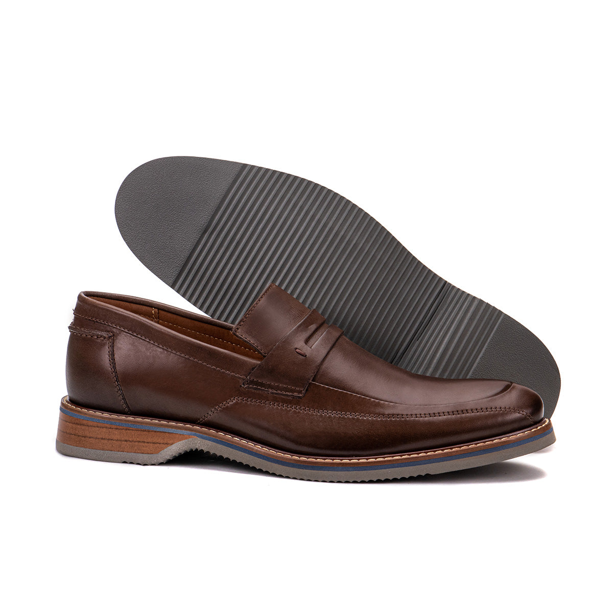 Hand-Stitched Soles: The soles, hand-stitched to the upper for style and durability, feature a thin gray foam layer, a woodgrain heel, and a thin blue stripe just below the brown leather welt. With or without the penny, these loafers are designed to look great and feel great all day long.