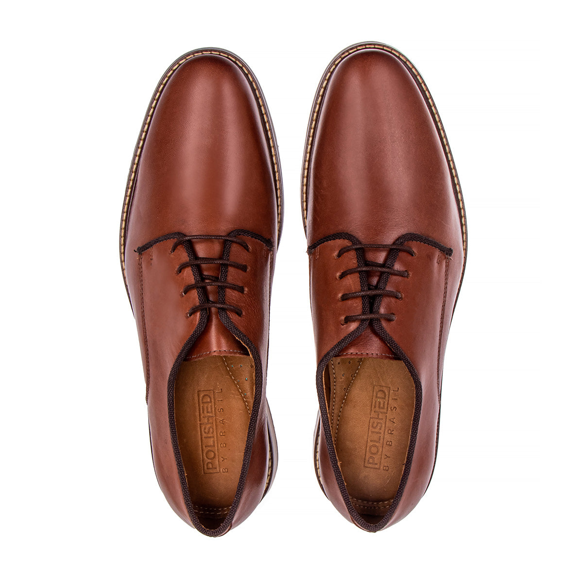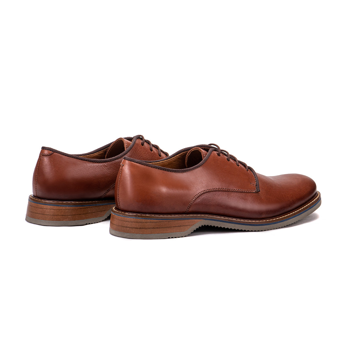 Classic Derby Dress Shoe: We took a classic derby dress shoe and added a foam and woodgrain sole to make it more comfortable and more interesting. The sole, hand-stitched to the upper for style and durability, features a thin gray foam layer, a woodgrain heel, and a thin blue stripe just below the brown leather welt.
